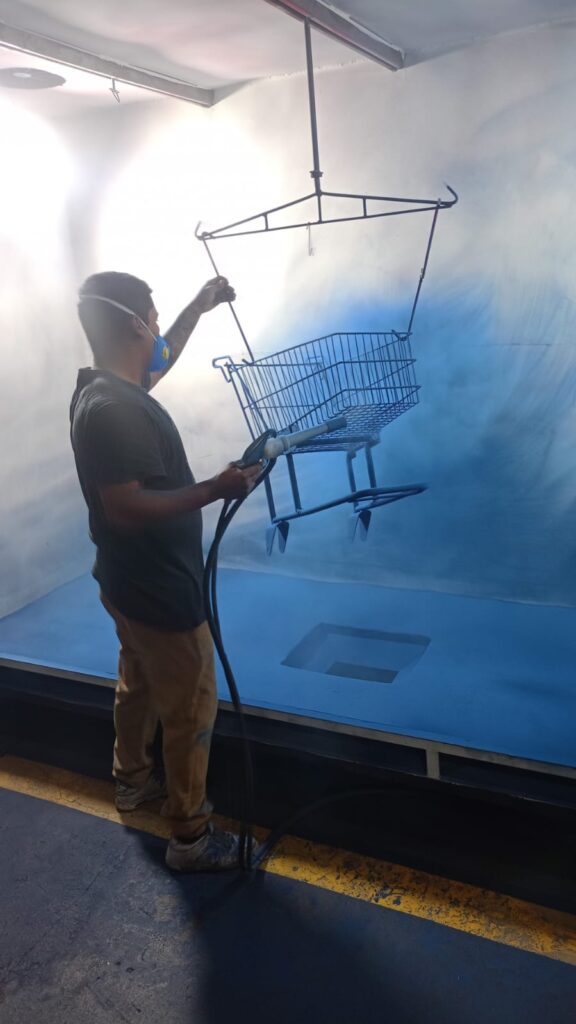 Após a aplicação do pó, a peça é transferida para uma estufa industrial